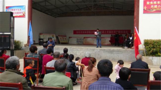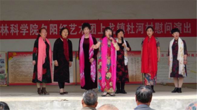 洛宁县上戈镇杜河村是洛阳农林科学院定点帮扶村。今年来,洛阳农林科学院以党建为引领,助力脱贫攻坚。结合实际,以产业扶贫为重点,开展丰富多彩的帮扶工作。扶贫先扶志,为了更好发挥好文化在脱贫攻坚中的重要作用,洛阳农林科学院经过积极筹划,由党委委员、副院长蓝育才带队,组织农林科学院老干部夕阳红艺术团40余人到杜河村进行慰问演出,既宣传党的政策,又丰富群众文化生活,以文化人,寓教于乐,使大家切身感受党的精准扶贫政策和党的关怀,进一步坚定广大群众脱贫的信心。