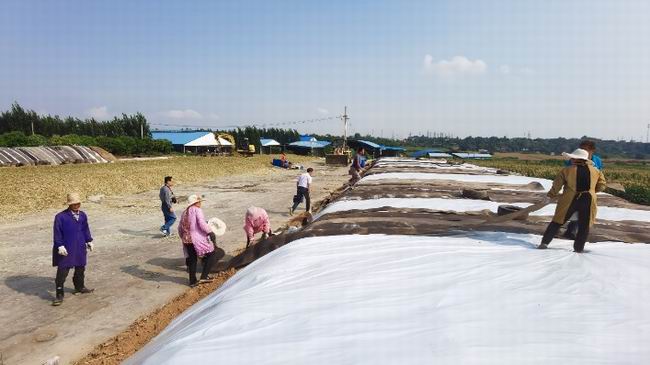青贮开始前先清理青贮池内的杂物,检查青贮池的墙体和地面,及时修补损坏的地方。清理后的青贮池最好让太阳曝晒3天,或者使用消毒液过硫酸氢钾进行消毒。在池壁两侧铺贴不少于8丝厚度塑料膜。