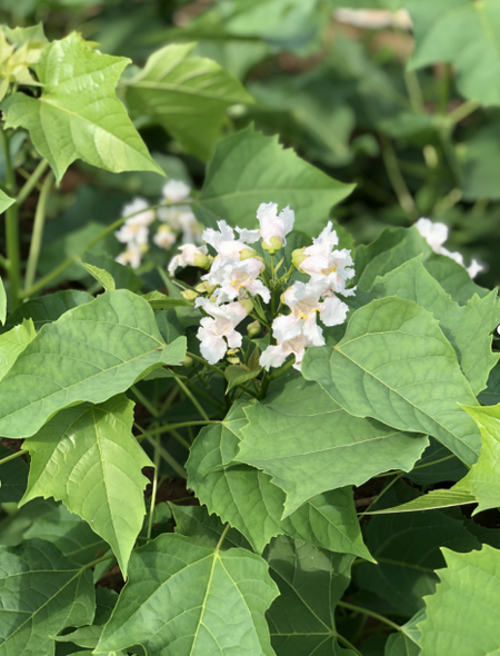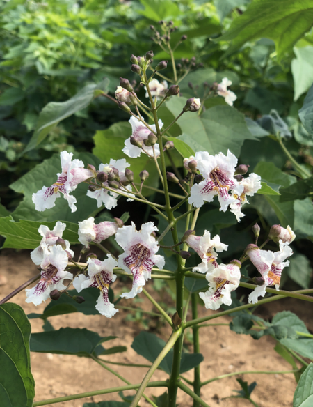 7月18日上午,我院楸树试验地内的一株当年楸树实生苗开出璀璨的花朵,层层叠叠的喇叭状花,白边带紫的花冠,鹅黄色的花蕊,紫红色斑点遍布花筒和花瓣上,淡紫素雅,秀丽动人,在周围其他楸树家系苗的白花和绿叶中更显色泽鲜红,分外醒目。