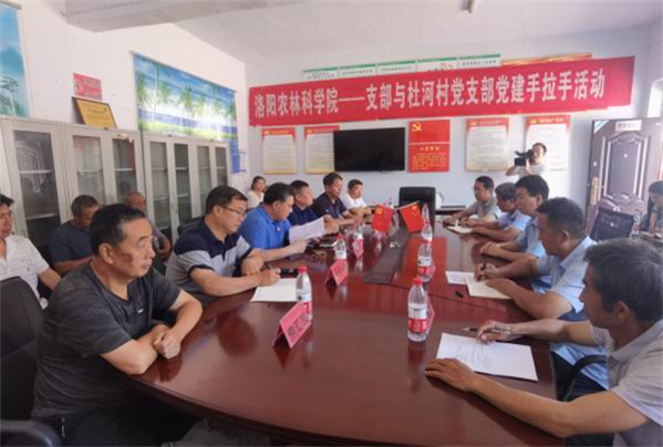 洛阳农林科学院与洛宁县上戈镇杜河村支部共建手拉手活动以来,为杜河村党建引领,奋力脱贫攻坚起到较好的带领和帮扶作用。在党史学习教育深入开展之际,2021年6月23日由洛阳农林科学院党组副书记兼纪委书记邓卫国、副院长蓝育才带队,一支部、六支部全体党员参加,围绕“扎实推进党史学习教育,科技服务杜河乡村振兴”主题教育,到杜河村开展支部共建手拉手活动。