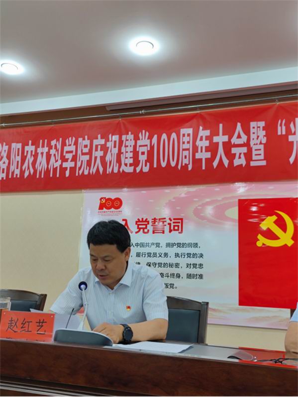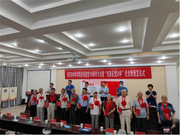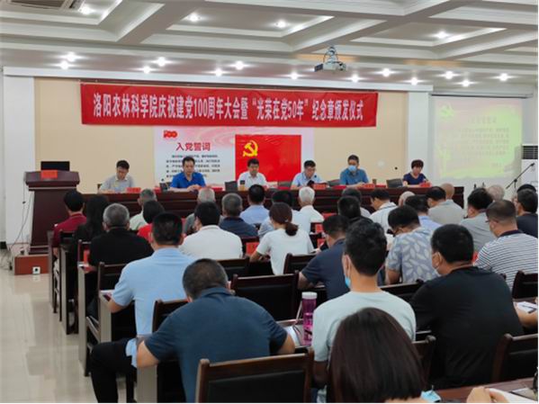 为庆祝中国共产党成立100周年,进一步增强新老党员的荣誉感、归属感、使命感,激励全院党员干部凝心聚力投身科研工作,6月28日上午,洛阳农林科学院举行了庆祝建党100周年暨“光荣在党50年”纪念章颁发仪式。院党组书记、院长赵红艺出席活动并讲话,院党组副书记、纪委书记邓卫国主持会议,院领导班子成员、全体在职党员、12位“光荣在党50年”老党员代表、部分离退休老党员、2021年新发展党员及入党积极分子参加了颁发仪式。