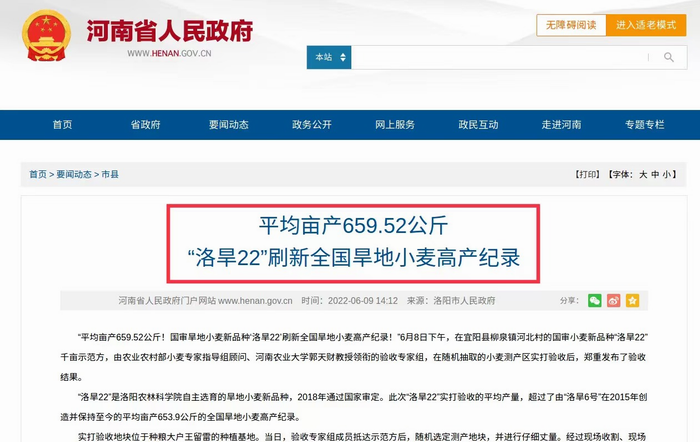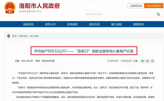 “平均亩产659.52公斤!国审旱地小麦新品种‘洛旱22’刷新全国旱地小麦千亩示范方高产纪录!”此次“洛旱22”实打验收的平均产量,超过了由“洛旱6号”在2015年创造并保持至今的平均亩产653.9公斤的全国旱地小麦高产纪录。“洛旱22”是洛阳农林科学院近年来培育的旱地小麦当家品种,不论是在旱肥地还是扩灌区,表现良好,在洛阳丘陵旱地推广面积很大,是河南省近两年来推广面积最大的旱地品种。