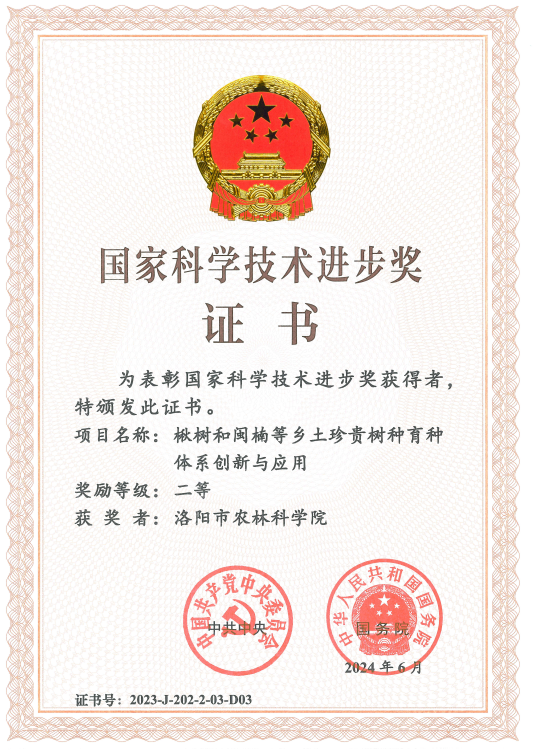 在6月24日召开的全国科技大会、国家科学技术奖励大会、两院院士大会上,2023年度国家科学技术奖名单公布,以我院“洛楸”系列品种选育及技术创新为主要内容的“楸树和闽楠等乡土珍贵树种育种体系创新与应用”项目获国家科学技术进步奖二等奖。这是我院科技创新的又一项重要“国家级”奖项。市政府予以贺信表彰,是对这一成果的充分肯定和对全院科技人员的最大激励、鼓励。