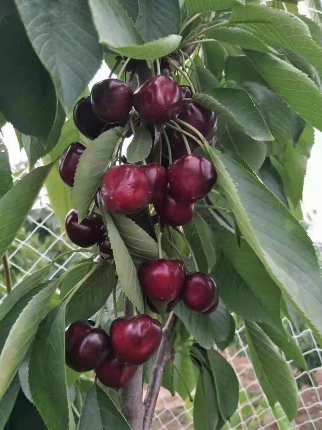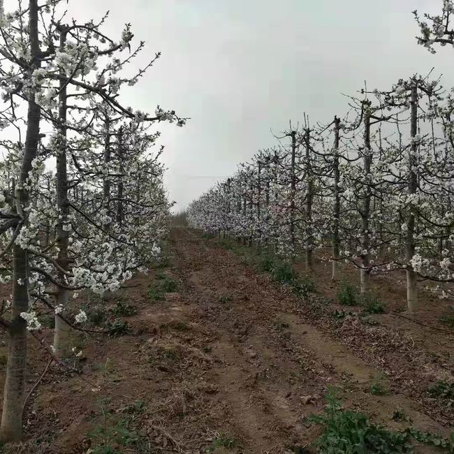 人工授粉:每年花期均进行人工授粉,用鸡毛弹子在不同品种大樱桃间交叉滚动。盛花期上午10点,下午4点,每棵树最少两遍。