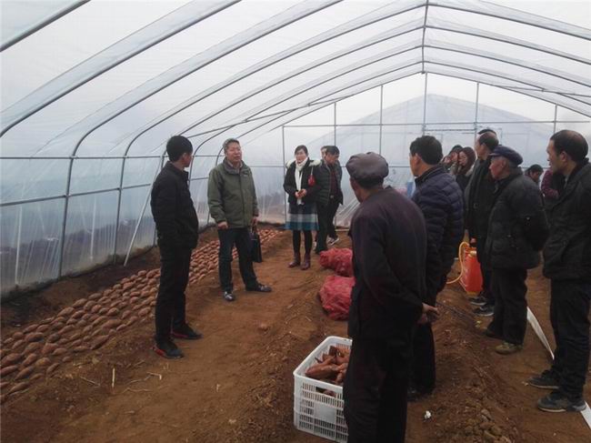 王自力研究员在育苗大棚现场重点讲解了红薯的摆放标准(上平下不平)、密度标准、苗床的底墒、覆土的厚薄等一系列红薯育苗的要点。在随后的座谈会上,驻村杨书记和村委领导请求以洛阳农林科学院甘薯谷子研究所为技术依托,引进红薯新品种、新技术,打好红薯高产种植第一仗。