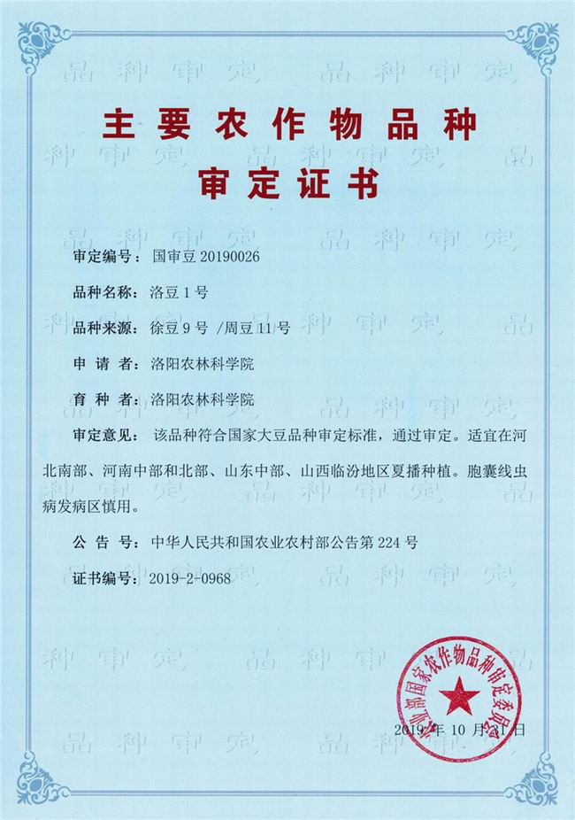 “洛豆1号”是继2017年河南省审定之后,历经两年国家(黄淮海中片)区域试验和生产试验的考验,于2019年末终获国家肯定。这项成绩的获得不仅是我课题组在大豆育种方面的一次重大突破,同时也标志着洛阳农林科学院在洛阳大豆育种历史上实现了一次重大跨越。