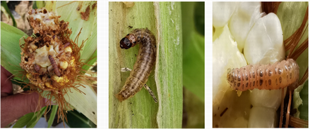 在玉米中后期为害,成虫把卵产在雄穗、雌穗、叶鞘合缝处,百株卵量最高达1729粒。主要蛀食雌穗,取食玉米粒,并能引起严重穗腐,且可蛀茎,造成植株倒折。严重影响玉米产量及品质,我市二代玉米螟幼虫为害盛期在7月下旬至8月上旬。近几年,桃蛀螟在我市有加重为害趋势。8月中下旬玉米抽雄后,是一个为害高峰;9月中下旬又是一个为害高峰期。这2种幼虫外形相似,在玉米上危害时间、部位也相近,所以很容易混淆。玉米螟淡褐色,头壳及前胸背板深褐色,有光泽,背线明显,暗褐色。桃蛀螟体背暗紫红色,腹面淡绿色。头、前胸背板
