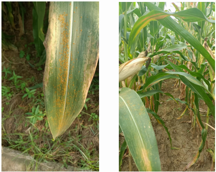 玉米锈病也属于真菌性的病害,一般多在玉米中后期发生较多,总体发生为害偏轻,但个别年份或地区有时会发病较重,对产量影响大。高温高湿的气候环境特别容易诱发玉米锈病,此外光照不足、种植密度过大、通风透气太差,也可以提高锈病发生的概率。玉米锈病主要以防为主,一旦发现有这种情况,必须及时防治,这种病菌传播非常快,如果大面积的发生了,那就很难控制了,会严重影响玉米的产量。去年雨水较多,我市各县玉米锈病普遍大面积发生。防治可喷施戊唑醇+肟菌酯或苯醚甲环唑+丙环唑+醚菌酯或氟环唑+吡唑醚菌酯进行防治,连续喷施2~3次,每次间隔7-10天。