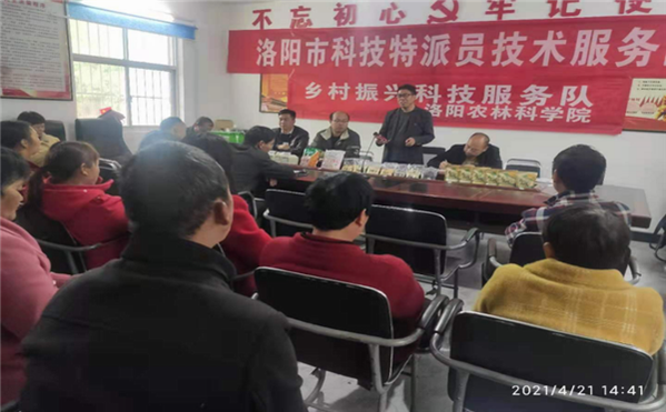 2021年4月21日,洛阳市科技特派员李小东、推广处处长韩卫红、我院玉米所梁晓伟副研究员和科研人员等到汝阳县三屯镇红军村进行技术培训。