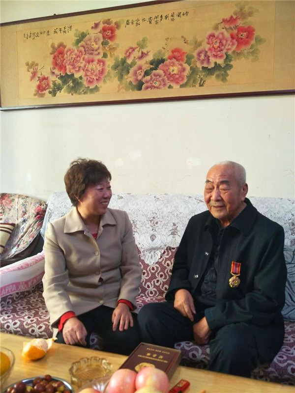 副院长刘改秀首先来到位于玻璃厂家属院的张善进家。一进家门,便看到老人家穿着干净的衣服,端坐在沙发上,虽然脚腿不便,但精神矍铄,腰板硬朗,身上保留着军人英姿。张善进的大女儿说:“听说你们要来,老人家非常兴奋,一大早就坐这等了。”副院长刘改秀为老人送去了中共中央、国务院、中央军委颁发的“中国人民志愿军抗美援朝出国作战70周年纪念章”并为老人戴上。