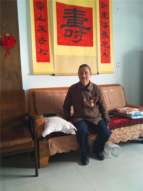 来到王崇家时,老人也是早早在家等候了。一见到我们,就热情的把我们让进屋内,端茶递水,分让水果。从老人的言谈举止,根本看不出这是一位耄耋之年,年近90高龄的老人。老人家耳不聋、眼不花,说话嗓音洪亮,思路清晰,非常善谈。当老人戴上“中国人民志愿军抗美援朝出国作战70周年纪念章”后,就侃侃而谈,与我们聊起了自身经历,从自己成为军队的宣传干事,一步一步走到领导岗位,再从自己身边的战友,到当时的艰苦岁月,老人仿佛又回到了那个战火纷飞的年代。